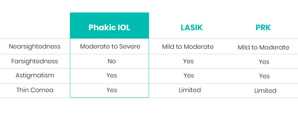 Phakic IOLs (intraocular lenses) is an alternative to LASIK and PRK eye surgery for correcting moderate to severe myopia (near-sightedness), and in some cases produce better and more predictable vision outcomes than laser refractive surgery.